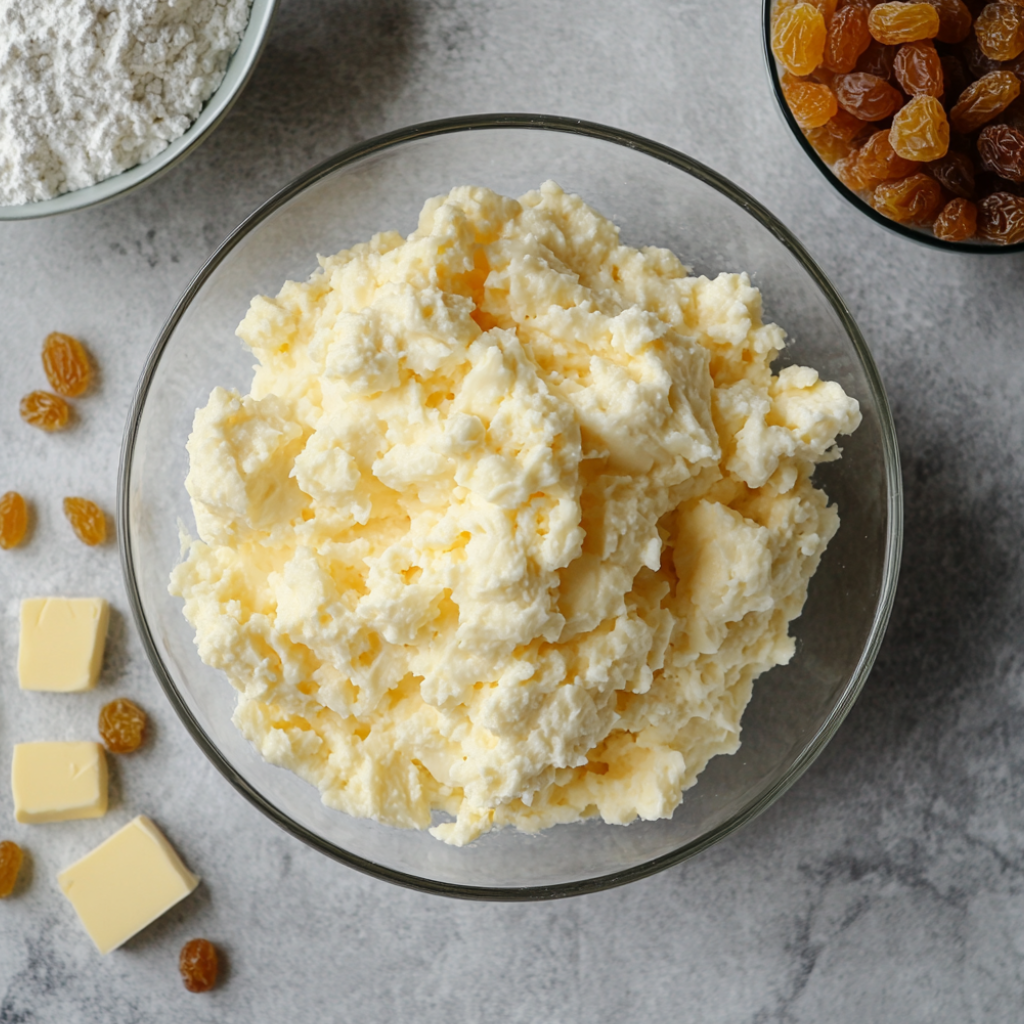 Творог жирностью 5% или 9% 200г; Сливочное масло 50г; Сахарная пудра 50г; Ванильный сахар 5г; Светлый изюм 15г.