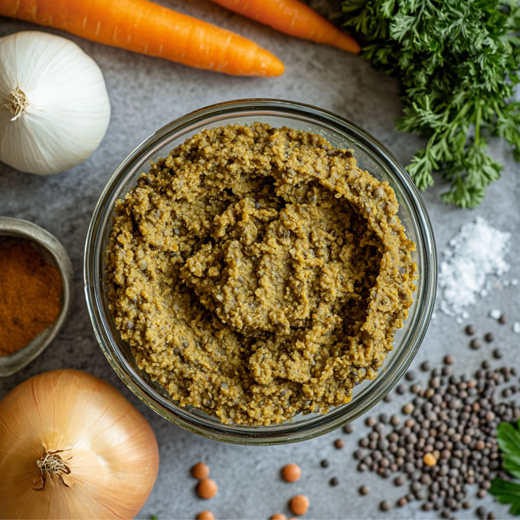 Подготовьте все необходимые ингредиенты Зеленая чечевица варится довольно долго, поэтому рекомендуется ее предварительно замочить в воде. А семена тыквы нужно слегка поджарить на сухой сковороде. Начинаем с самого длительно готовящегося ингредиента: бобовые промыть и залить водой в пропорции 1:5 (для сухой чечевицы, предварительно замоченной, воды нужно меньше). Довести до кипения. Убавляем нагрев плиты до минимального и томим чечевицу при очень медленном кипении до мягкости. Время зависит от вида и степени подготовки бобовых, варьируется в пределах 30-60 минут. Когда чечевица станет мягкой, начать подготовку остальных компонентов паштета. Очистить и крупно нарезать лук и морковь. На части оливкового масла обжарить овощи, а затем тушить до готовности под крышкой, влив немного воды. Когда морковь станет мягкой, заправить свежемолотым перцем и солью. Затем овощи отправить в стакан погружного блендера. Следом за обжаренными овощами в стакан отправить семена тыквы и подсолнечника. Пробить массу, желательно оставить легкую фактуру продуктов. Добавить в стакан блендера размягченную чечевицу (в рецепте взята половина сварившейся массы), пробить до желаемой степени мягкости. Переложить паштет в широкую емкость и заправить по вкусу оливковым маслом, солью и перцем. Паштет готов. Разложить его в баночки, закрыть крышками. В холодильнике можно свободно хранить такой продукт дней 6-7. Подавайте паштет как закуску на праздничный стол с чипсами или тостами. В повседневное время чечевичный паштет – отличный вариант для бутербродов к завтраку.