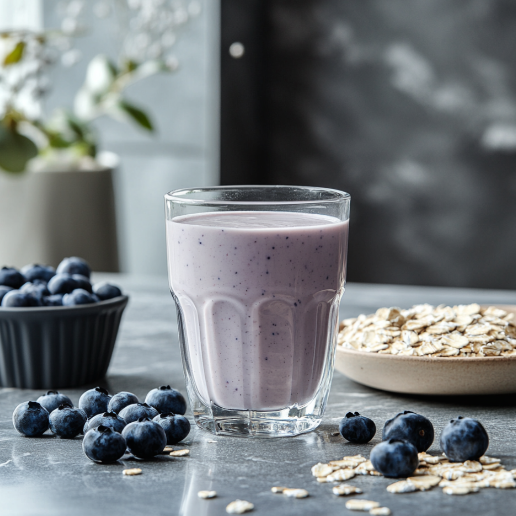 Подготовьте все необходимые ингредиенты Овсяные хлопья залить горячей водой и отправить на 2 минуты в микроволновку на мощности 850 Вт. В готовую кашу добавьте чернику и пюрировать блендером. Залить смесь молоком и снова взбить. Чтобы сделать смузи более сладким, можно добавить мёд, ягодный сироп или варенье.