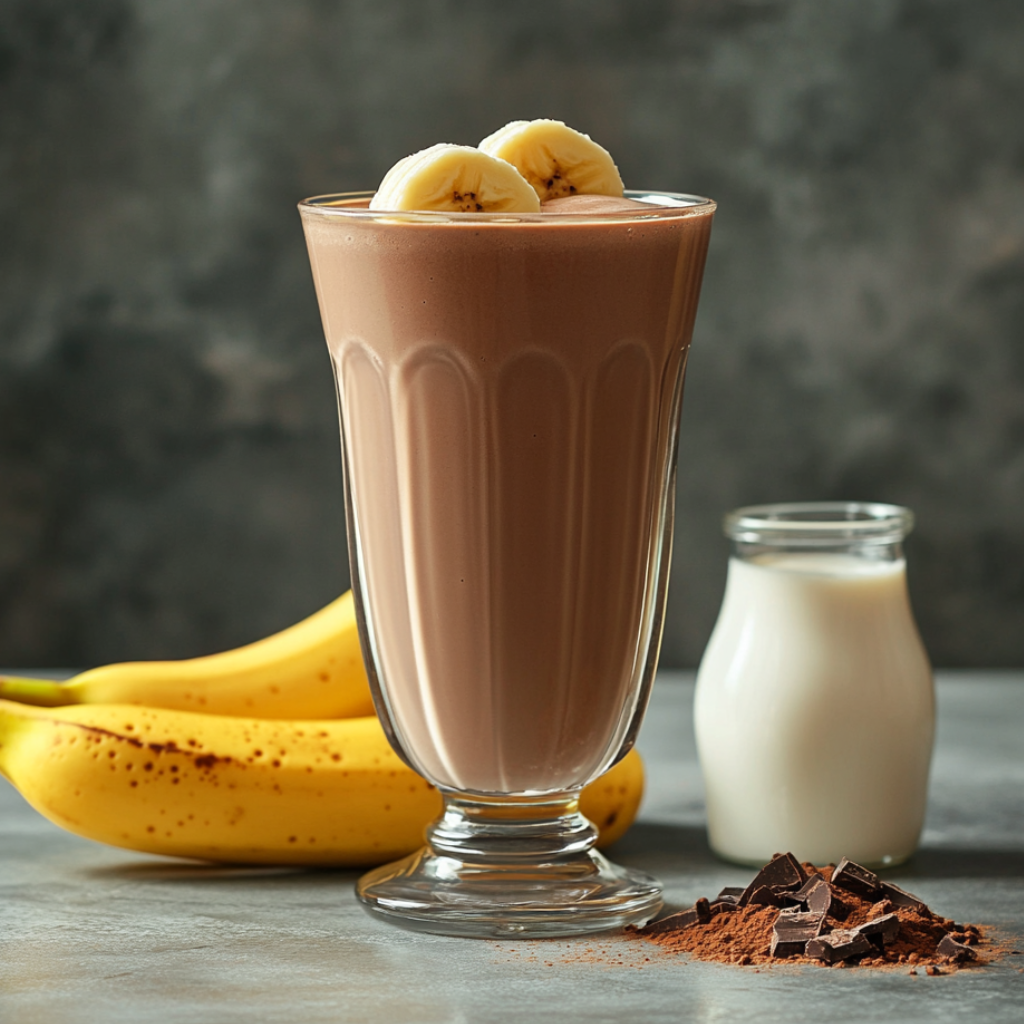 Банан 1шт; Ванильное мороженое 100г; Какао-порошок 5г; Ванильный сахар 2г; Молоко 300мл.
