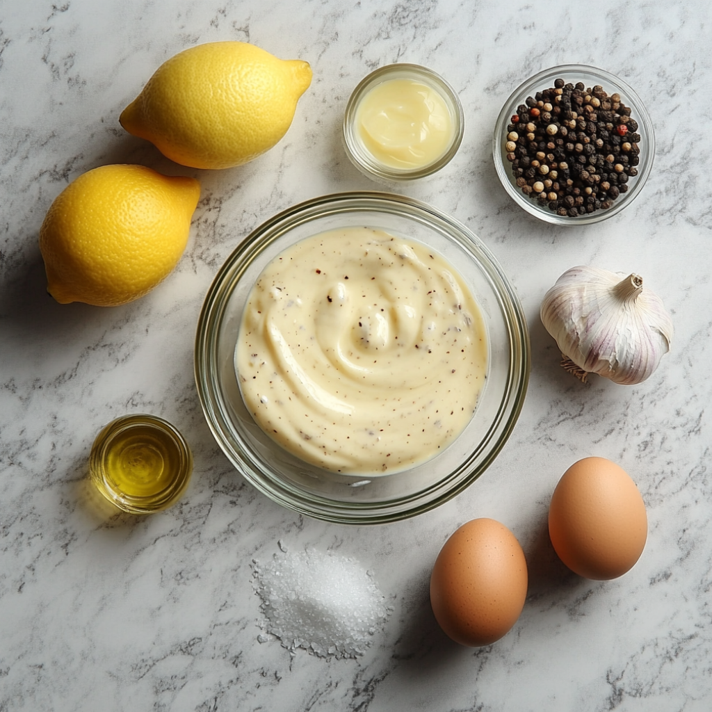 Куриные яйца 2шт; Растительное масло 1ст.; Лимонный сок 1ст.л.(или 0,5 лимона); Чеснок 2 зуб.; Соль по вкусу; Перец черный молотый по вкусу;