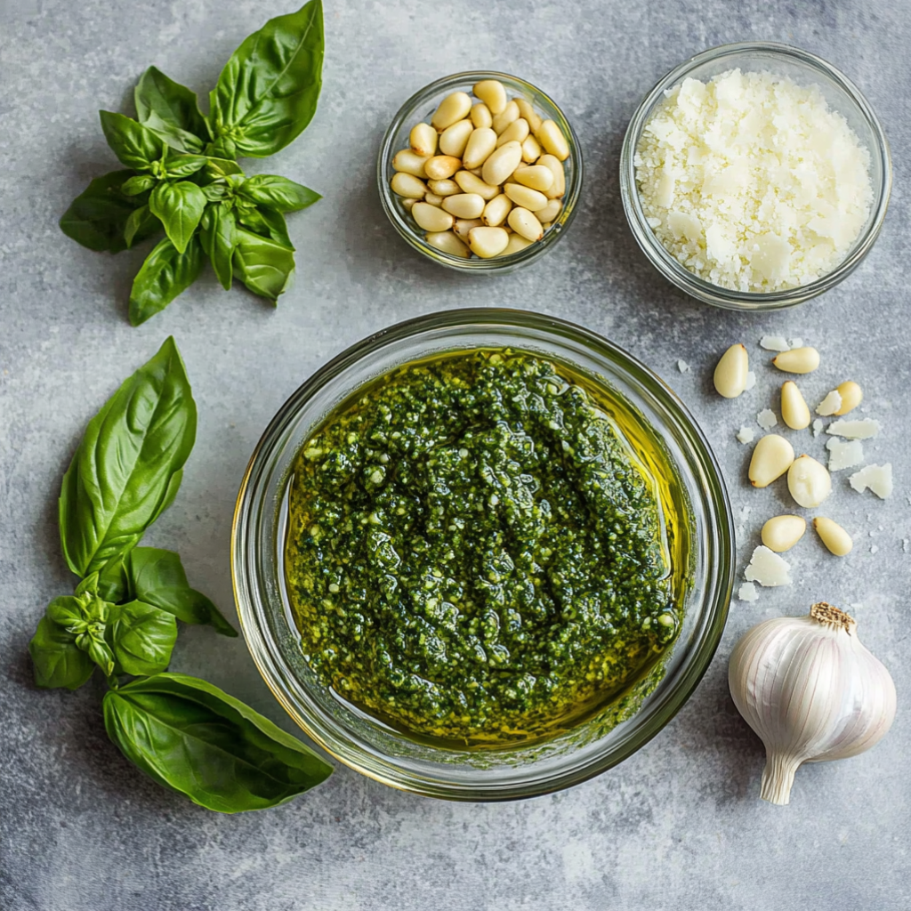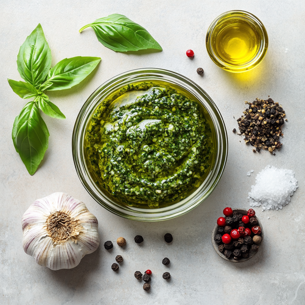 Базилик 150гр; Чеснок 2 зубч.; Оливковое масло 30мл; Лимонный сок 30мл; Перец черный молотый по вкусу; Соль по вкусу;
