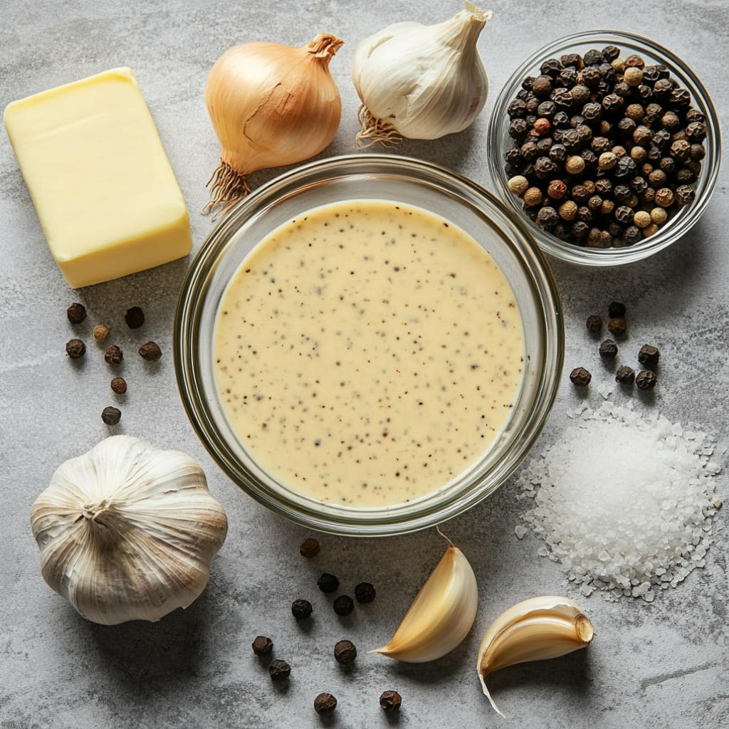 Сливочное масло 1ст.л.; Вода (Кипяток) 200мл.; Сливки 200мл; Перец горошком 1 ч.л; Чеснок 1зубч.; Лук репчатый 1шт; Соль по вкусу;