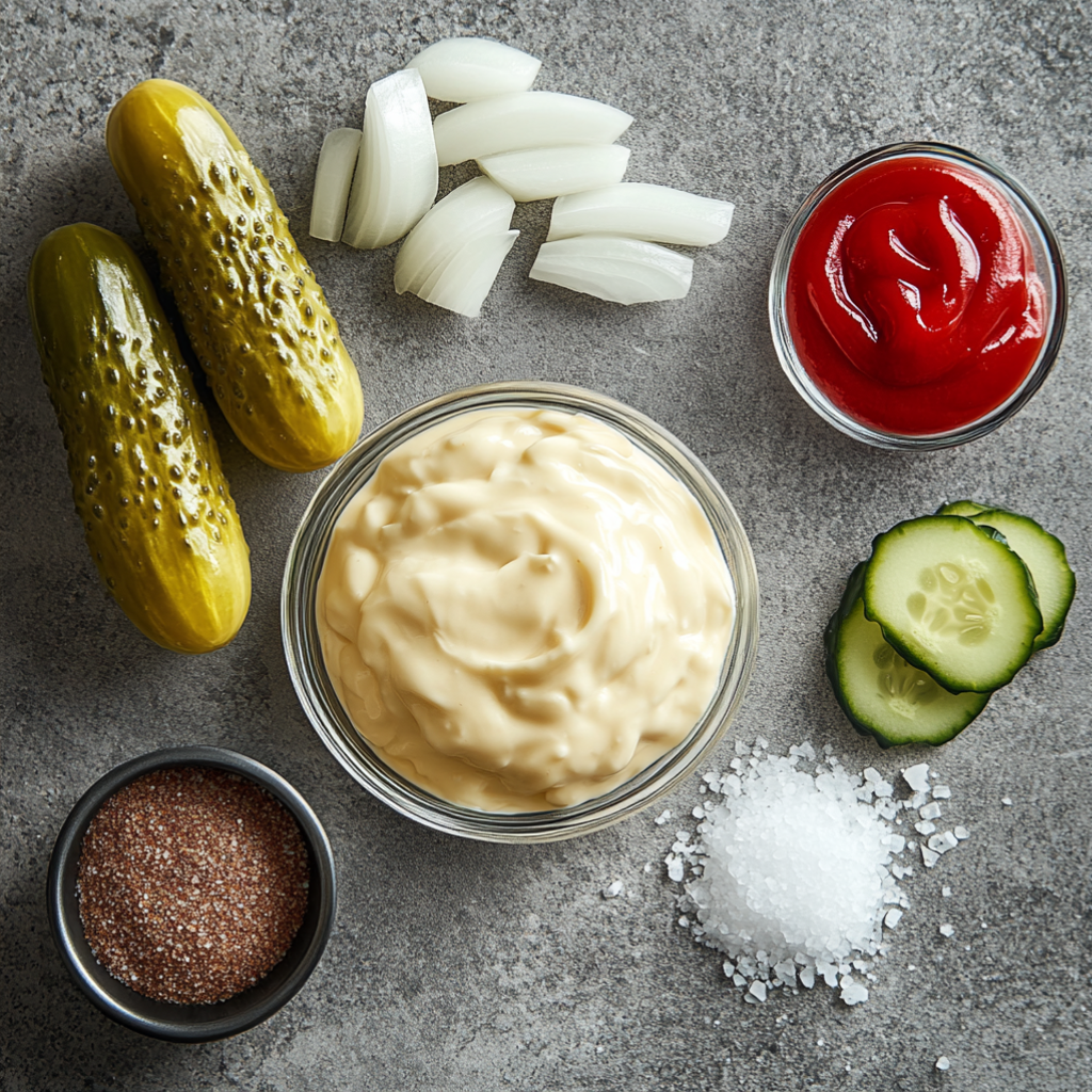 Майонез 2ст.л; Маринованные огурцы 1шт; Лук репчатый 0.5шт; Кетчуп 1ч.л; Яблочный уксус 0.5ч.л; Сахар 0.5ч.л; Соль 2гр; Паприка 2гр;