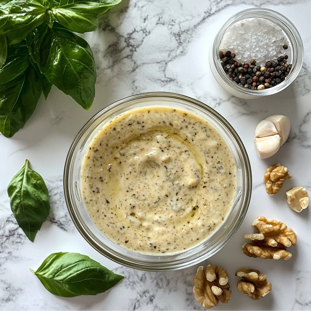 Йогурт (натуральный) 200гр.; Грецкие орехи 100гр.; Базилик 100гр.; Чеснок 2 зубч.; Перец черный молотый по вкусу; Соль по вкусу;