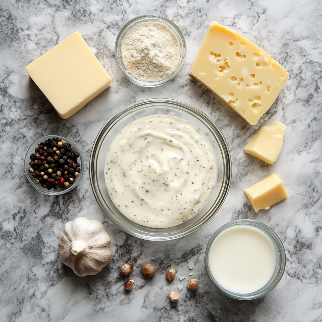 Сливочное масло 30гр; Пшеничная мука 1ст.л; Чеснок 1зубч.; Орегано сухой 1ст.л; Молоко 150мл.; Твёрдый сыр 30гр; Мускатный орех по вкусу; Перец черный молотый по вкусу; Соль по вкусу;