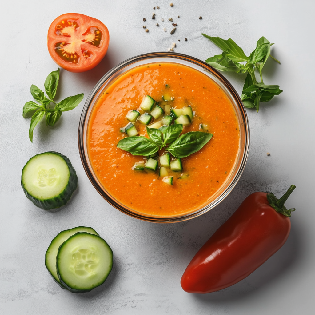 Подготовьте все необходимые ингредиенты Испанский лёгкий суп-пюре особенно хорош в жару – его подают холодным. Очистить помидоры, огурец, лук от шкурки, а перец — от семечек. Половину овощей пюрировать блендером, добавить томатный сок, нарезанную кинзу, уксус и масло. Тщательно перемешать, посолить, поперчить и добавить табаско. Если пюре получилось густым, разбавьте его водой до консистенции йогурта. Оставшиеся овощи нарежьте кубиками и добавьте в суп. Затем поставьте гаспачо на полчаса в холодильник. Подавайте с зеленью: петрушкой, сельдереем или базиликом.